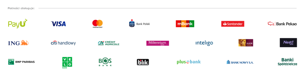 • Płatności PayU – Płatności online – pozwolą Ci na natychmiastową realizację transakcji. PayU oferuje płatności online dla klientów największych banków w Polsce. Wybierz dogodną opcję zapłaty dla Ciebie.
