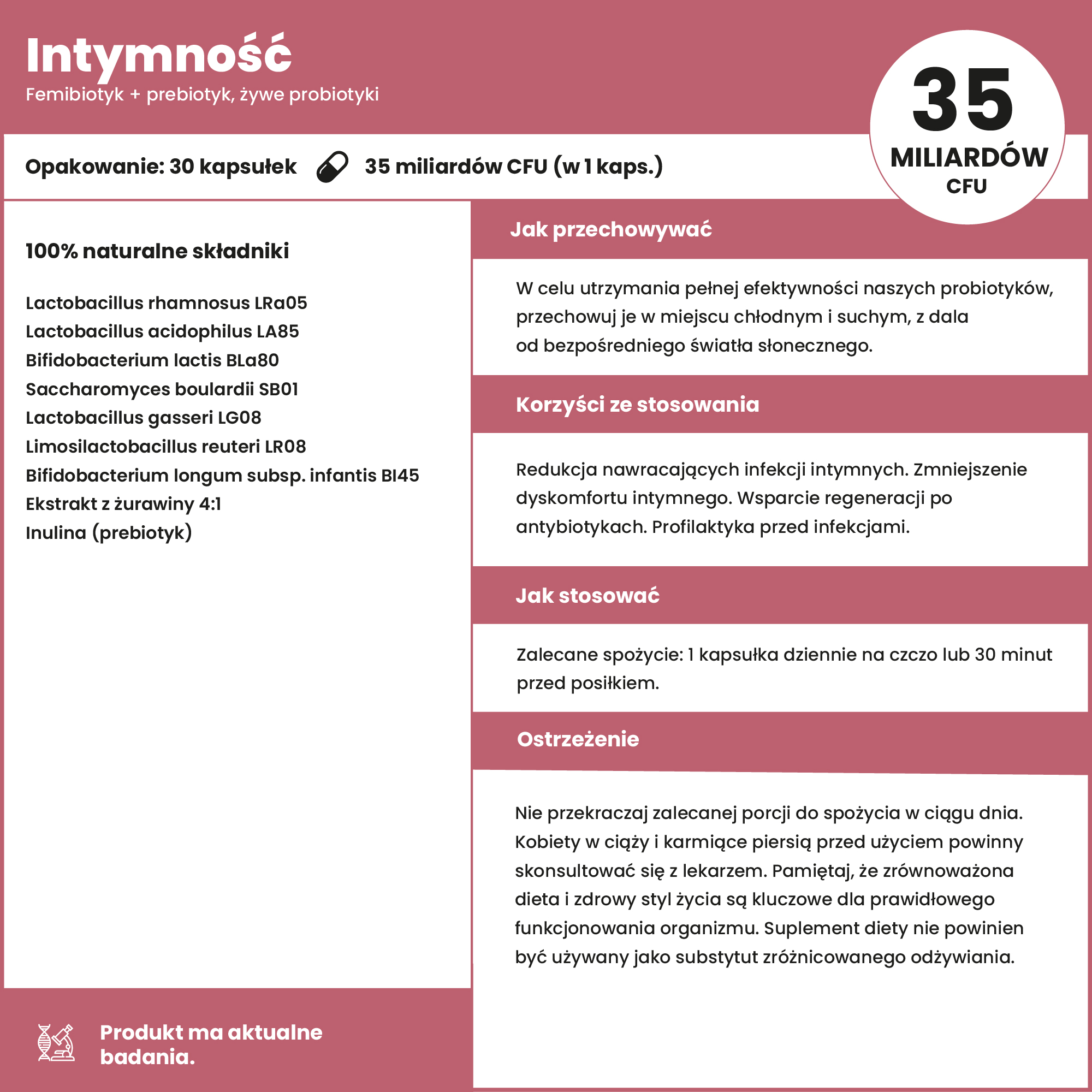 które chcą wspierać swoją mikroflorę w sposób systemowy – od środka. Jego zadaniem nie jest tylko łagodzenie skutków infekcji, ale przywracanie i utrzymywanie naturalnej równowagi organizmu, która chroni okolice intymne każdego dnia.Nasze klientki potrzebowały czegoś więcej niż doraźna pomoc. Szukały wsparcia, które stanie się częścią codziennej troski o siebie.Dlatego stworzyliśmy formułę opartą na synergii żywych kultur bakterii, ekstraktu z żurawiny i prebiotyku – składników o udokumentowanym działaniu wspierającym mikroflorę intymną i układ moczowy.