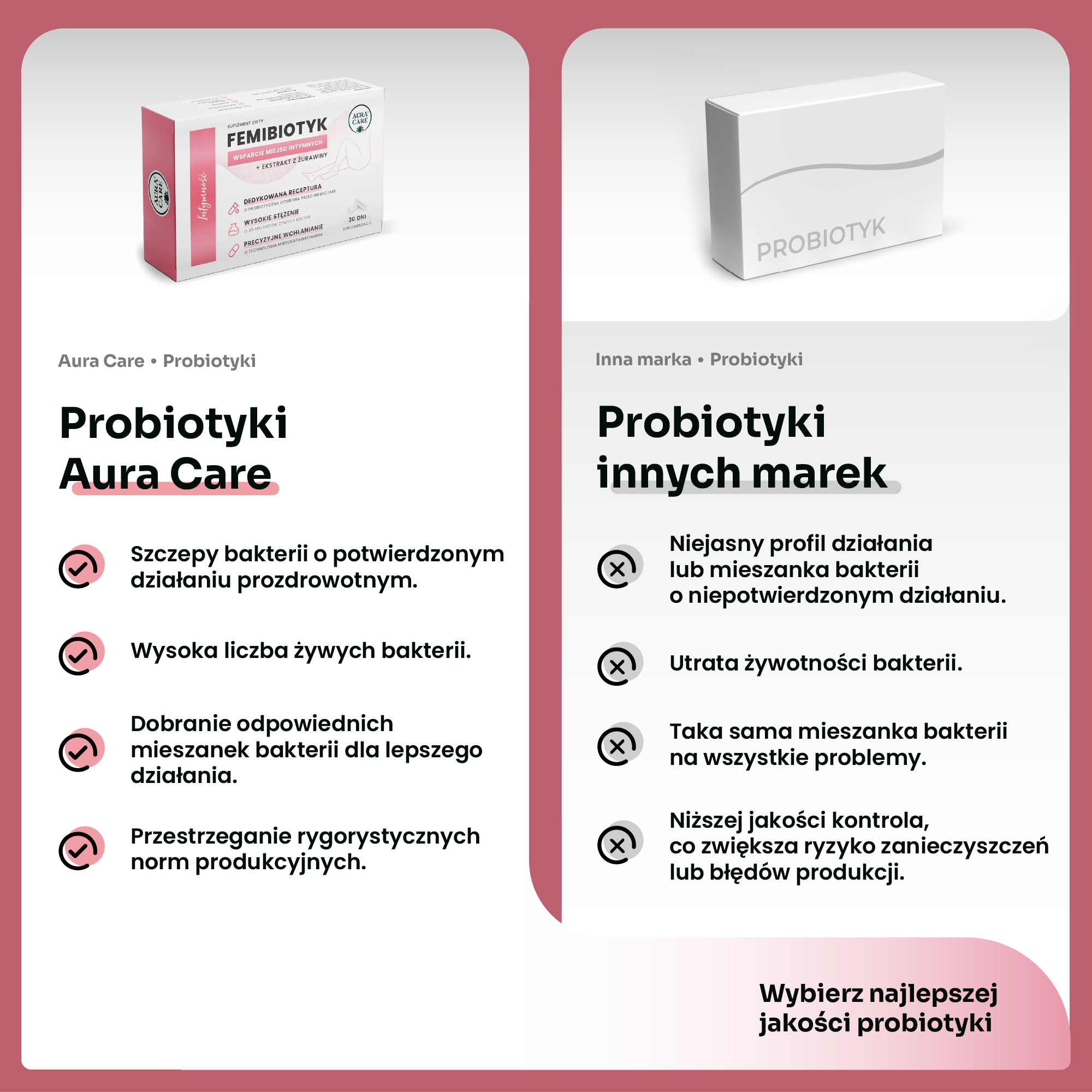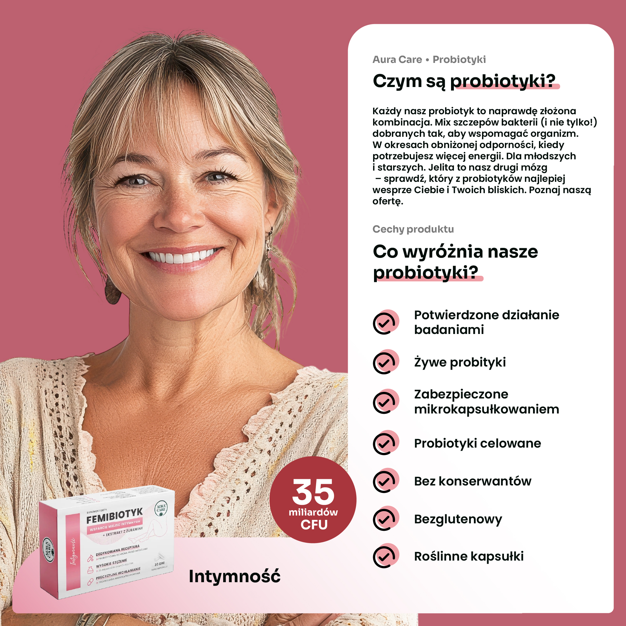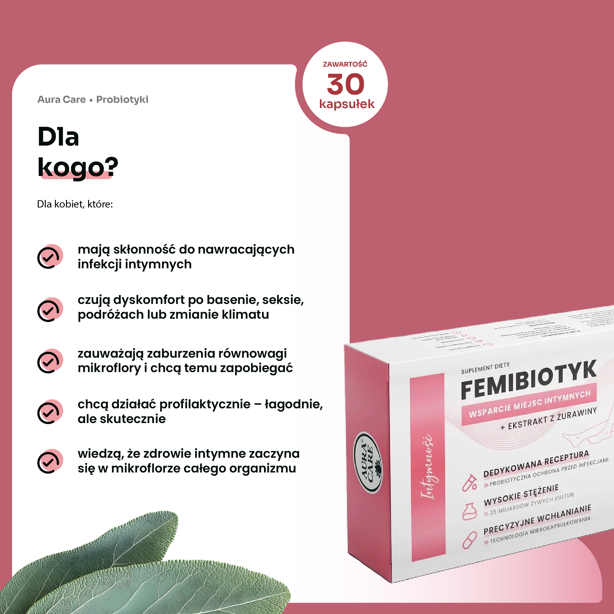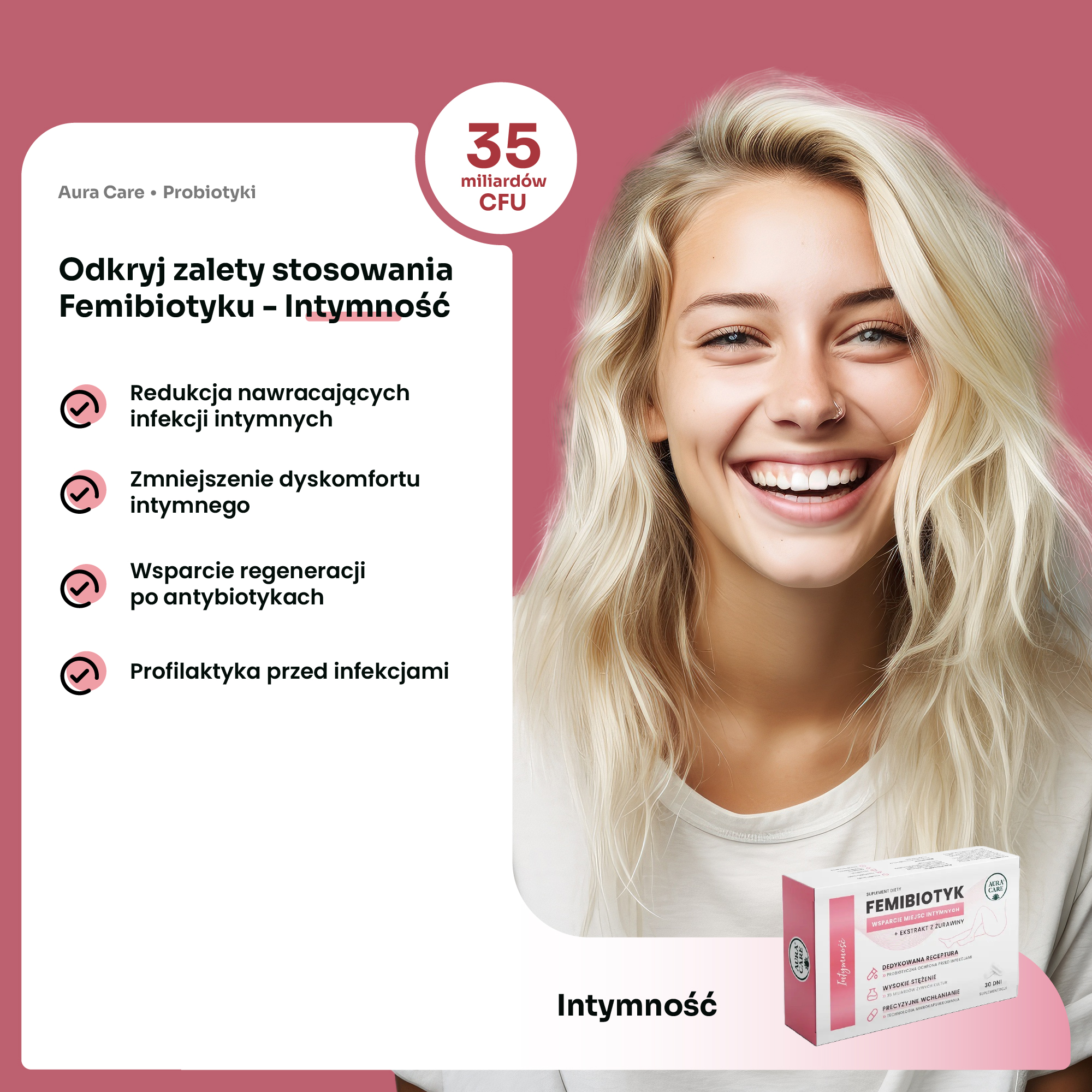 Probiotyk dla kobiet Intymność Femibiotyk + prebiotyk, żywe probiotyki Probiotyki Aura Care | 35 miliardów CFU