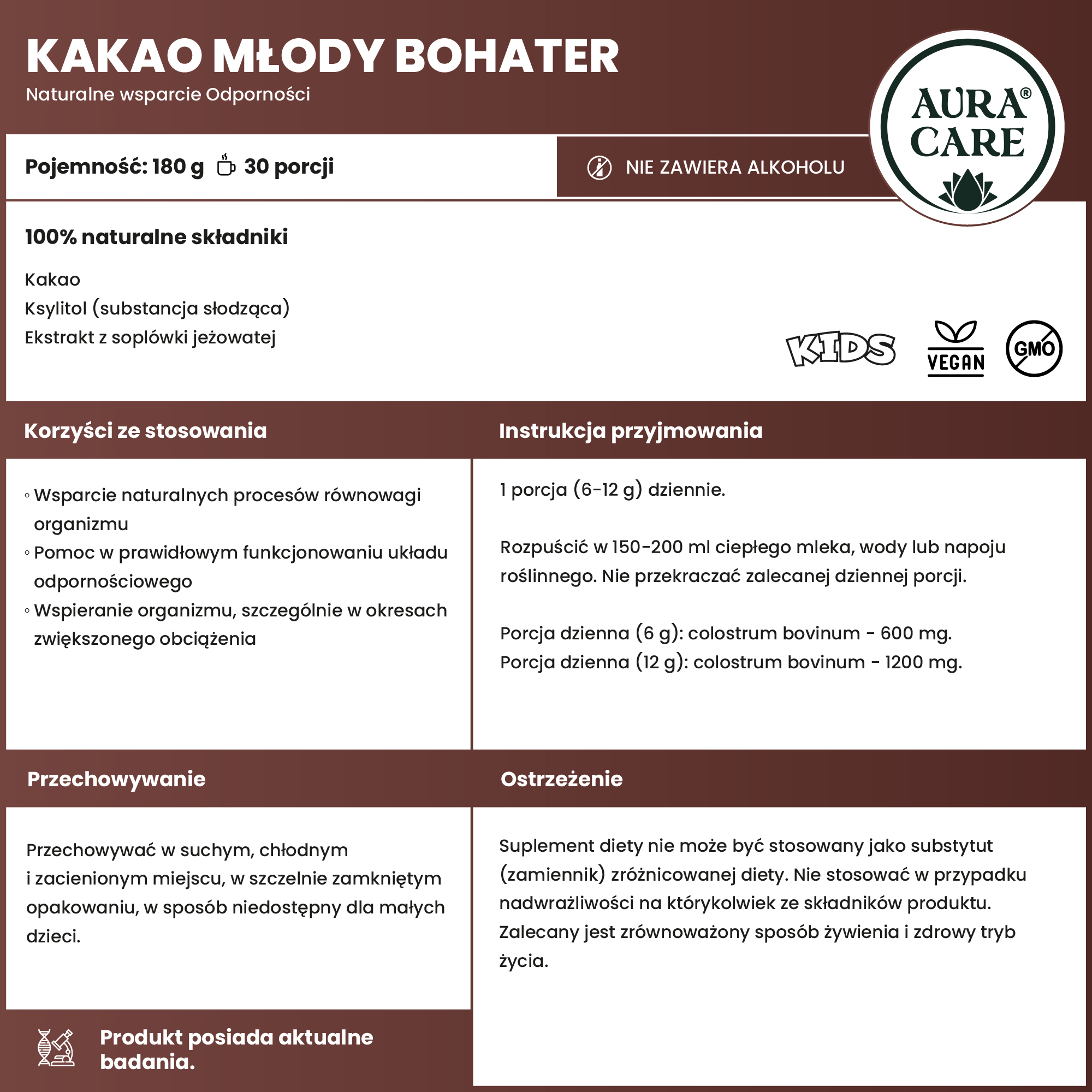 2. Dla wszystkich Młodych Bohaterów, którzy są podatni na infekcje lub mają za sobą cięższe choroby i antybiotykoterapie. Smaczny napój pomoże powrócić odporności do normy, będzie też odpowiednim rozwiązaniem dla każdego niejadka. Jego smak przypadnie do gustu całej rodzinie, kakao Aura Care może być stosowane również przez nieco starszych bohaterów.