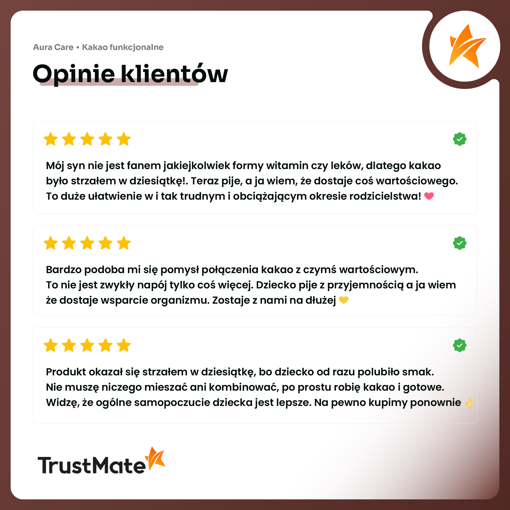 1.  Wprowadzenie zdrowego rytuału do Waszej codzienności – nasz produkt to nie tylko pyszny napój, ale to kakao funkcyjne, o składzie mającym maksymalnie wspierać odporność organizmu każdego dnia. Chcąc ułatwić kontynuowanie nawyku, zadbaliśmy nie tylko o wspierający organizm skład, ale i o smak! Słodki napój to połączenie naturalnego kakao i zdrowszej alternatywy dla cukru, jaką jest ksylitol.