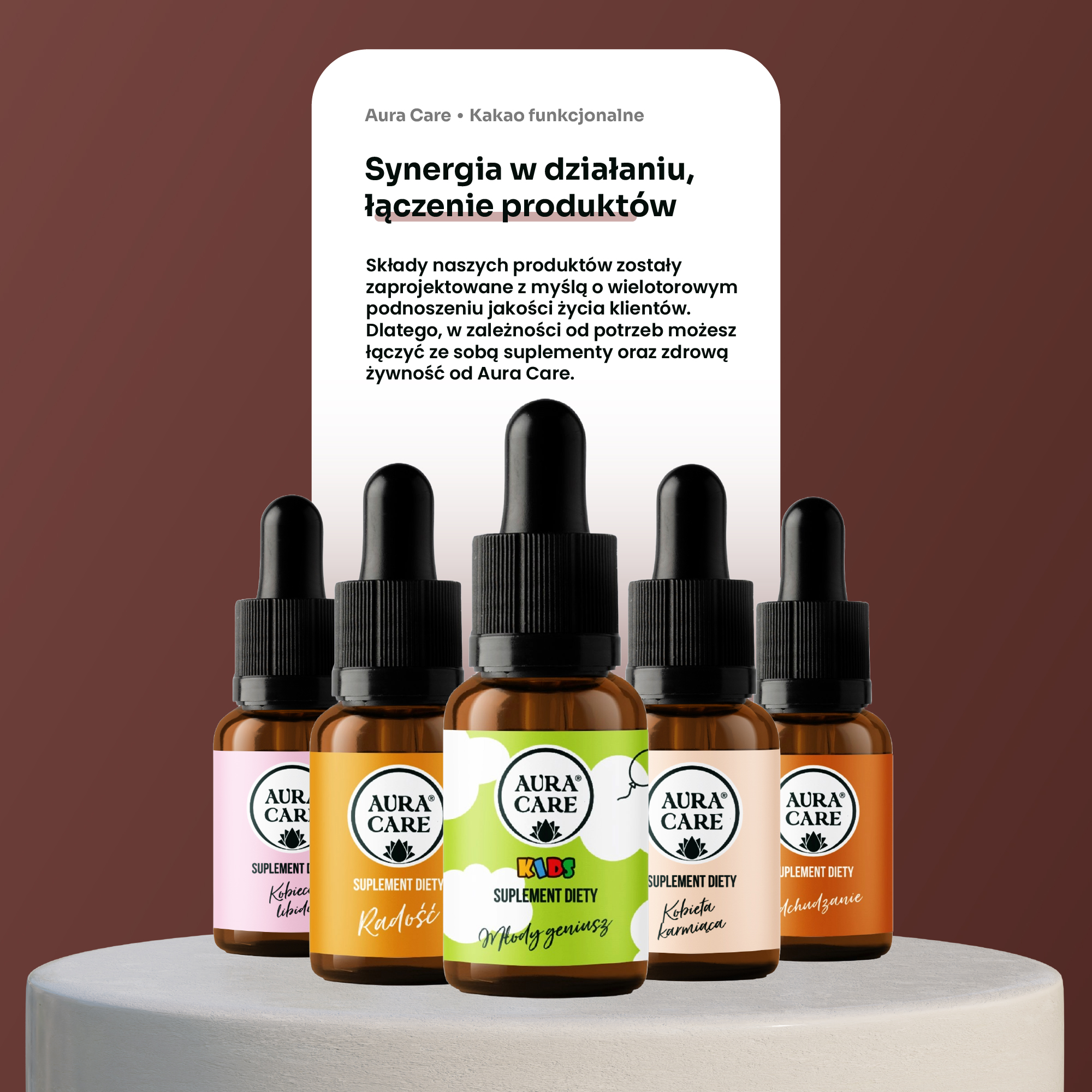 Składy produktów Aura Care zostały zaprojektowane z myślą o wielotorowym podnoszeniu jakości życia naszych klientów dlatego w zależności od potrzeb olejki można ze sobą łączyć. Jeśli masz pytania dotyczące stosowania, użyj chatu. Pomożemy.