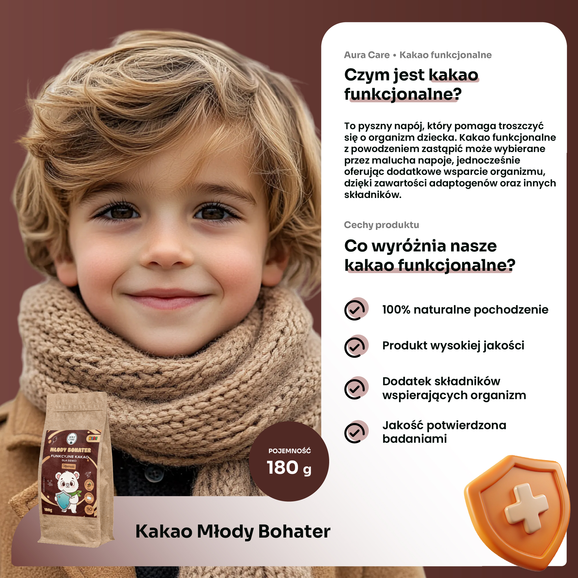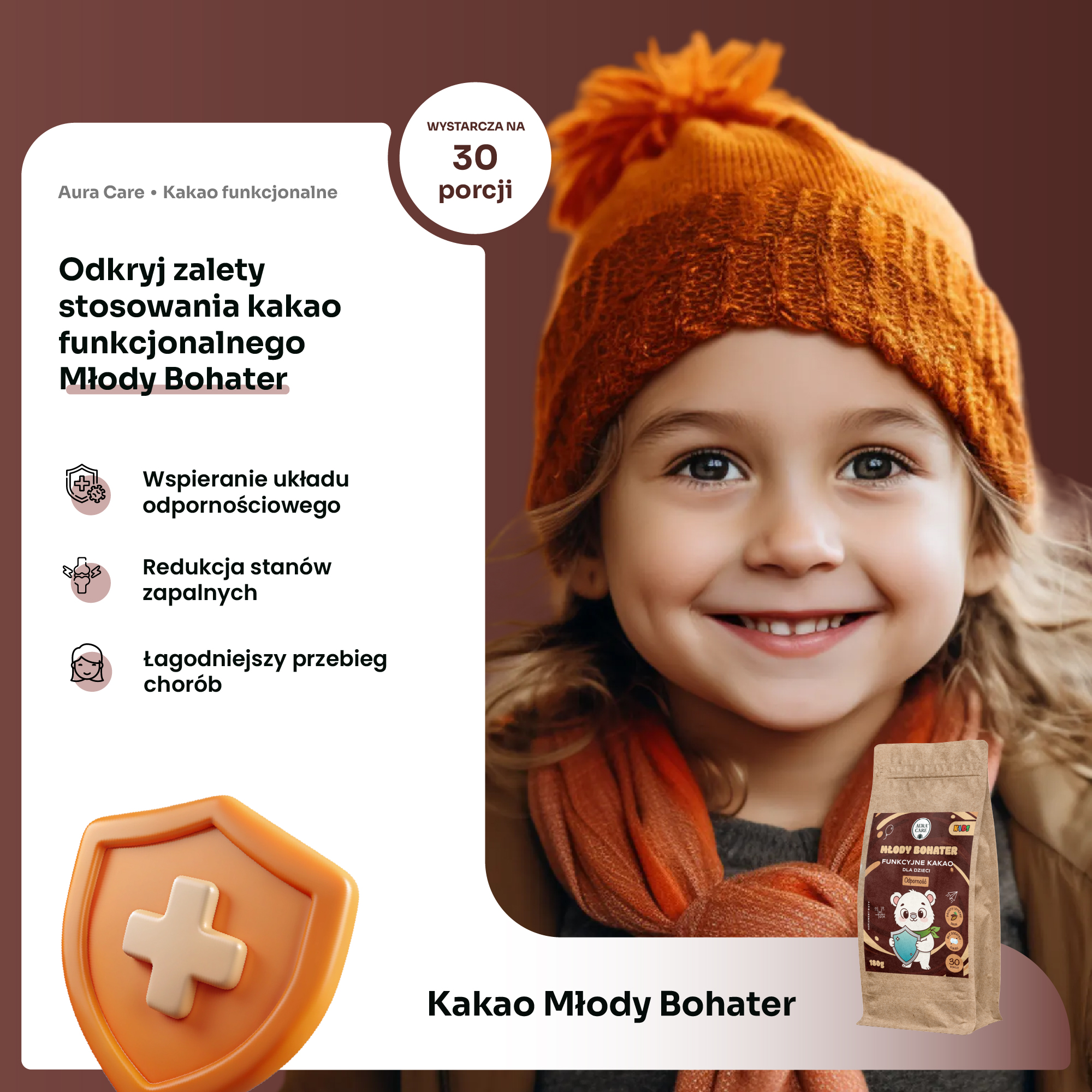 - Dla wszystkich Młodych Bohaterów, którzy są podatni na infekcje lub mają za sobą cięższe choroby i antybiotykoterapie. Smaczny napój pomoże powrócić odporności do normy, będzie też odpowiednim rozwiązaniem dla każdego niejadka. Jego smak przypadnie do gustu całej rodzinie, kakao Aura Care może być stosowane również przez nieco starszych bohaterów.