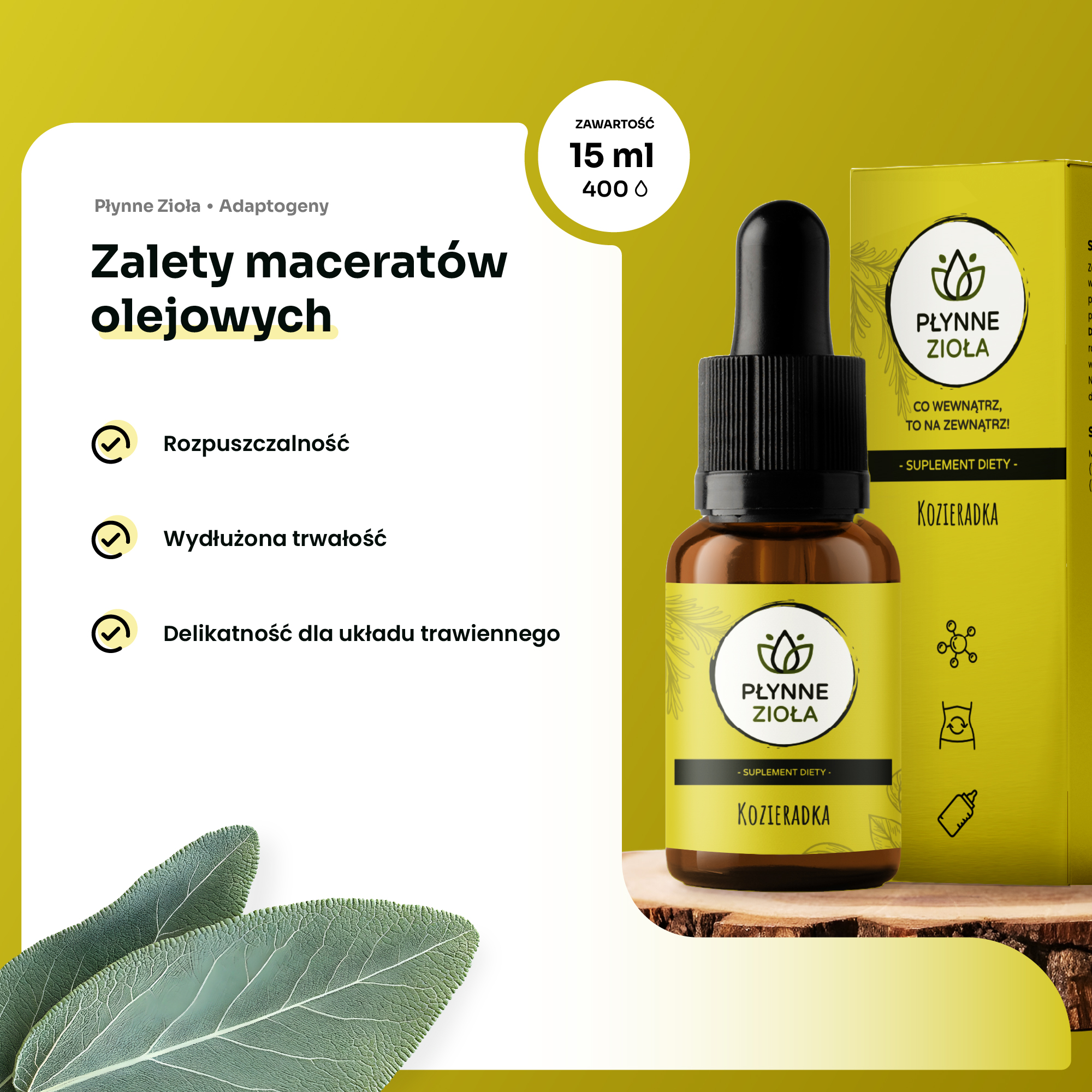 • Wygoda przyjmowania: Macerat olejowy jest łatwiejszy do przyjęcia, zwłaszcza dla osób, które mają trudności z połykaniem kapsułek. Wystarczy nanieść kilka kropel olejku na  lub pod  język, co może być bardziej komfortowe niż połykanie kapsułek.