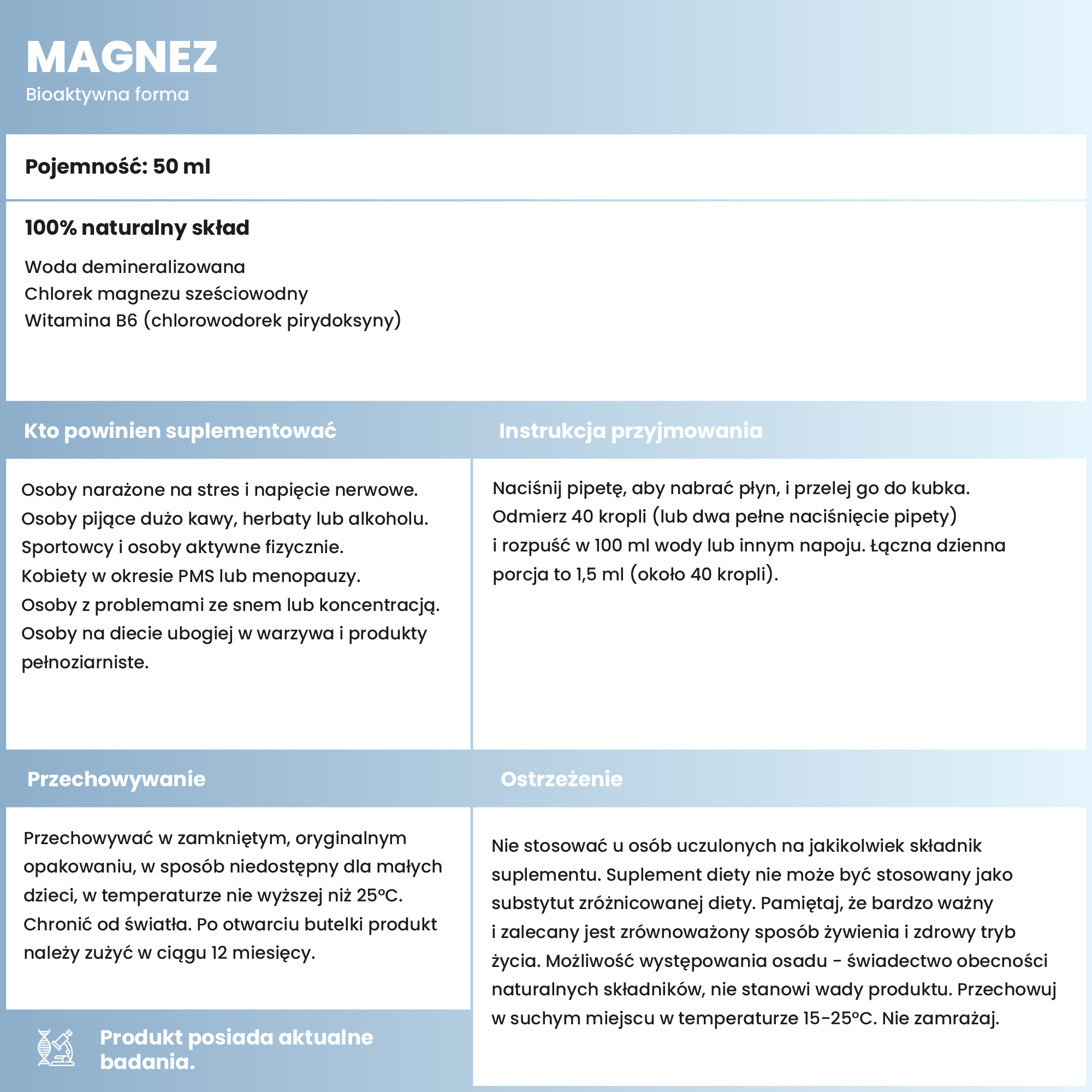 Nasz preparat zawiera magnez w postaci chlorku magnezu sześciowodnego, rozpuszczony w wodzie – dzięki czemu: