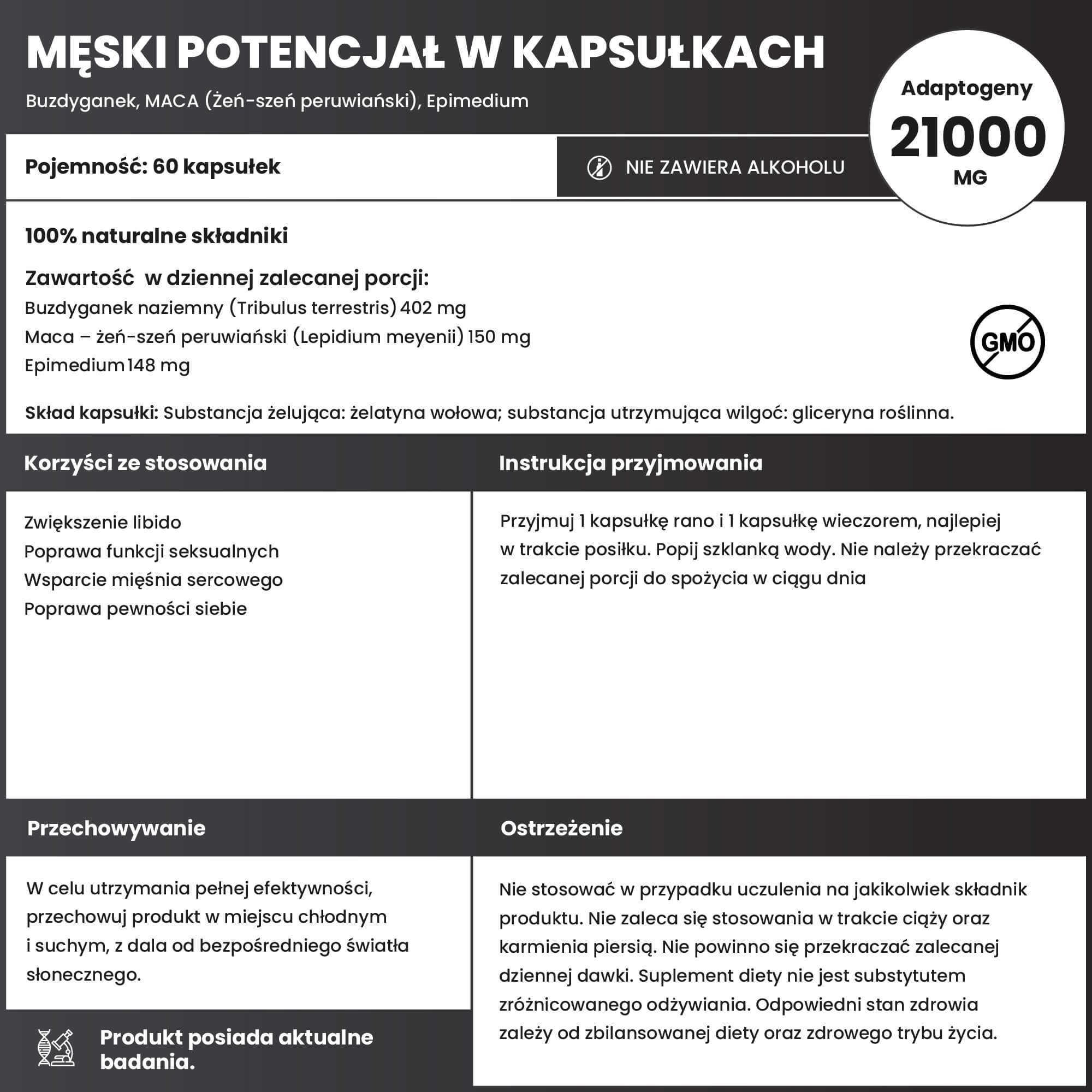 Dzięki naszej autorskiej metodzie maceracji każdy składnik zachowuje maksymalną ilość substancji aktywnych w naturalnej formie. Proces jest czasochłonny, ale to właśnie on odpowiada za wysoką skuteczność naszych preparatów.Teraz tę samą jakość i moc znajdziesz w formie kapsułek żelowych – wygodnych i pozwalających na precyzyjne, codzienne stosowanie, co w przypadku suplementów na potencję i energię jest szczególnie istotne.