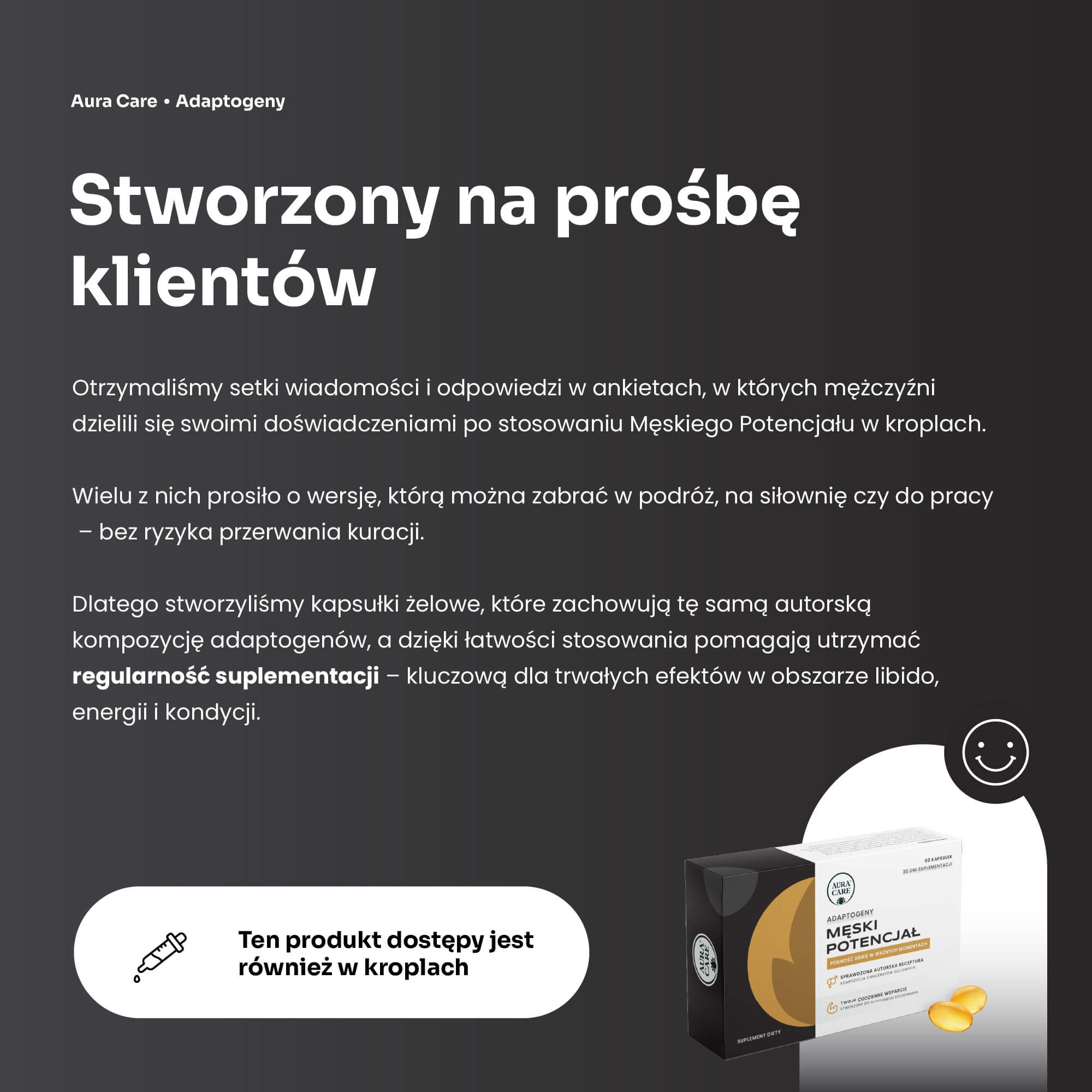 Dlatego stworzyliśmy kapsułki żelowe, które zachowują tę samą autorską kompozycję adaptogenów, a dzięki łatwości stosowania pomagają utrzymać regularność suplementacji – kluczową dla trwałych efektów w obszarze libido, energii i kondycji.