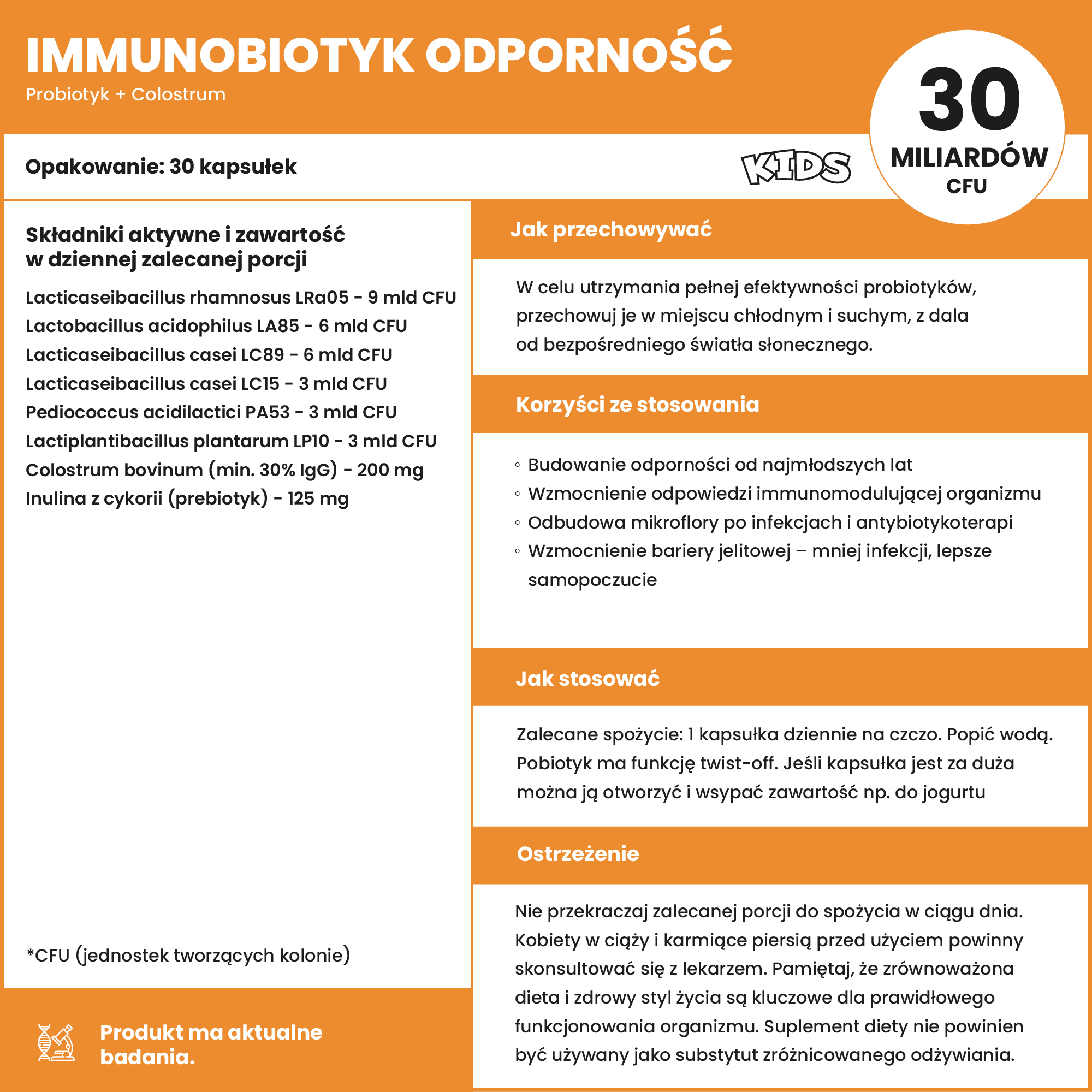 Każdy składnik Immunobiotyku został dobrany tak, by wspierać organizm w okresach zwiększonego obciążenia – podczas stresu, infekcji czy po antybiotykoterapii. Probiotyki pomagają przywrócić równowagę mikroflory jelitowej, wspierając aż 70% komórek odpornościowych, które znajdują się właśnie w jelitach.