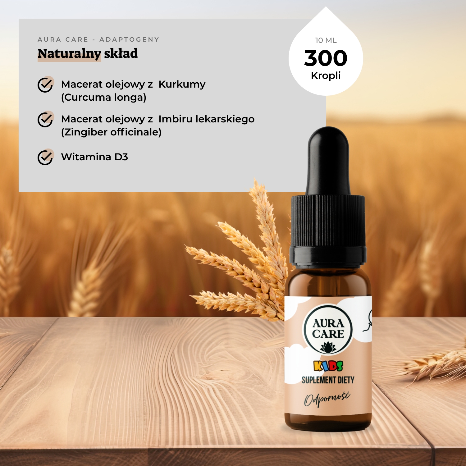 Adaptogeny dla dzieci, Odporność, Kurkuma, Imbir lekarski, Witamina D3, Adaptogeny Aura Care