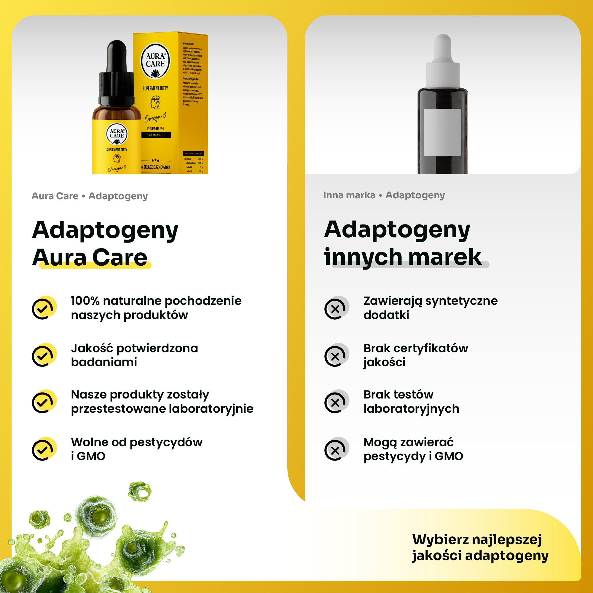 W przeciwieństwie do ryb, algi nie gromadzą metali ciężkich, dioksyn ani mikroplastiku. Są hodowane w czystych, kontrolowanych warunkach – dlatego są idealne dla kobiet w ciąży, dzieci i osób z wrażliwym organizmem.