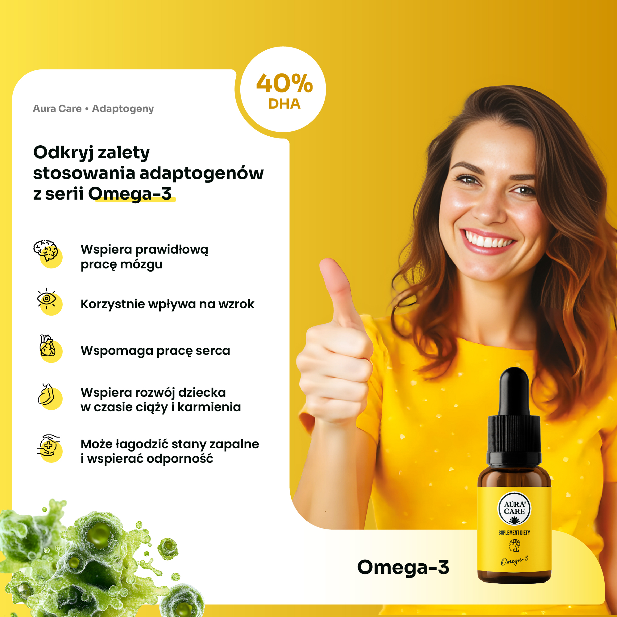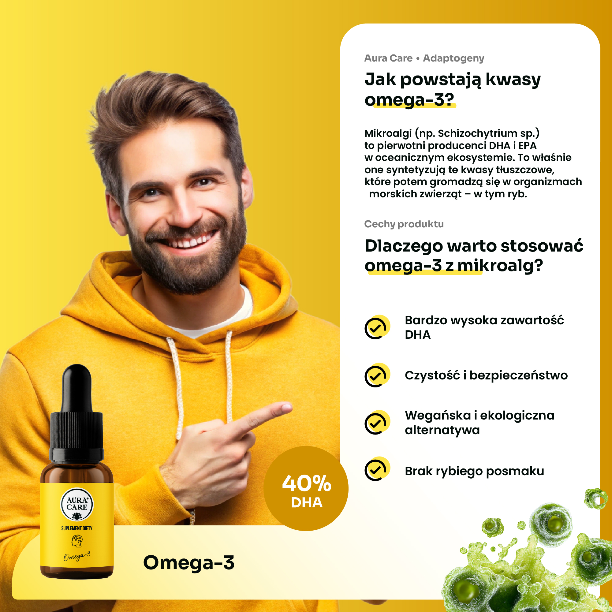 Czy da się to rozwiązać inaczej? Tak – sięgając po omega-3 z ich pierwotnego źródłaczyli z mikroalg. To rozwiązanie wykorzystaliśmy w naszym produkcie Omega-3, uzyskując stężenie aż 40% DHA. Dlaczego to takie ważne dla naszego organizmu?