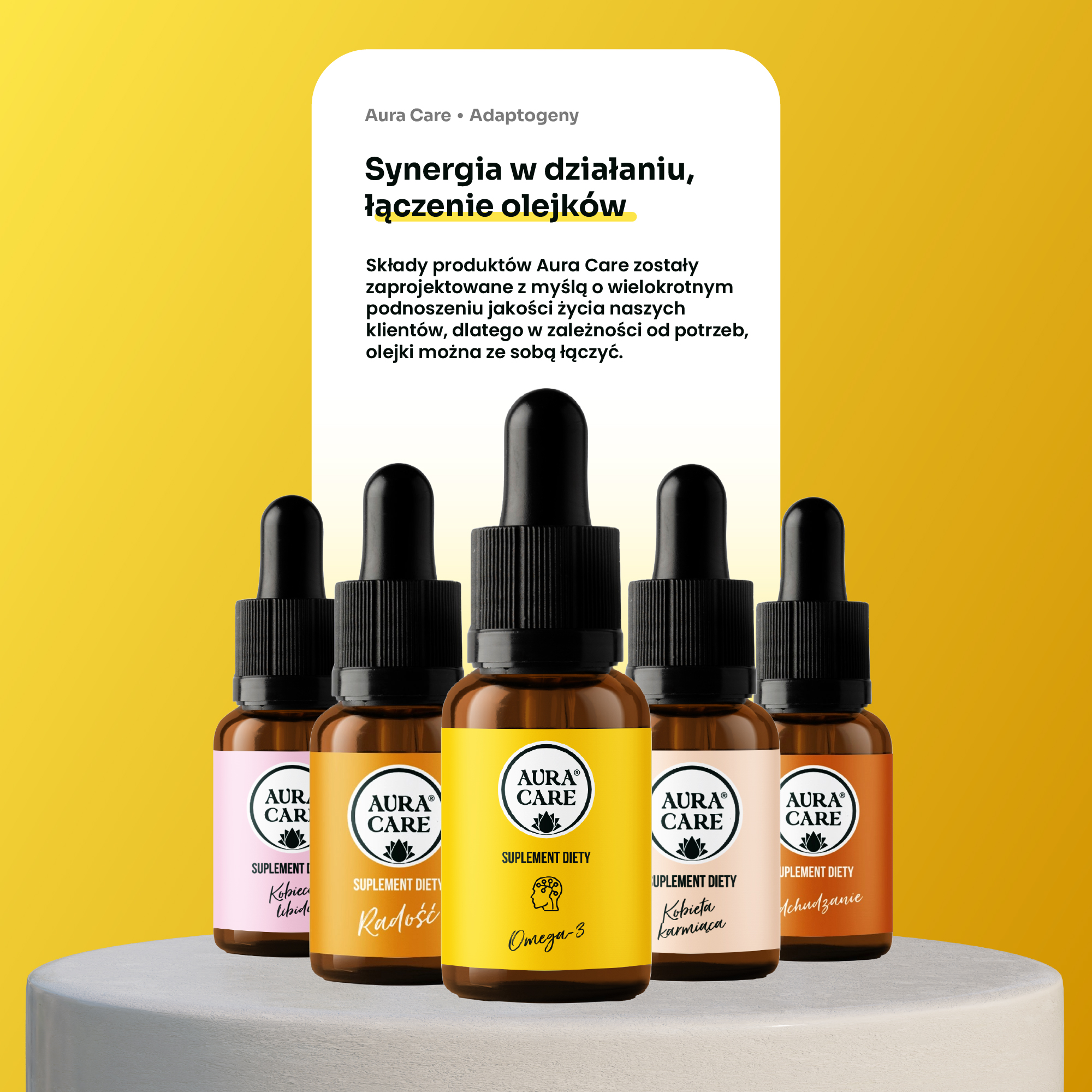 Olejki, probiotyki, witaminy, kolagen – potrzeby naszych organizmów są złożone, a my tworząc produkty Aura Care, myśleliśmy o tym, jak holistycznie się o niego zatroszczyć. Możesz bezpiecznie przyjmować kilka olejków jednocześnie, łączyć olejek z probiotykiem i zadbać także o skórę dzięki kolagenowi. Masz wątpliwości jak je dobrać? Skontaktuj się z naszym zespołem specjalistów.