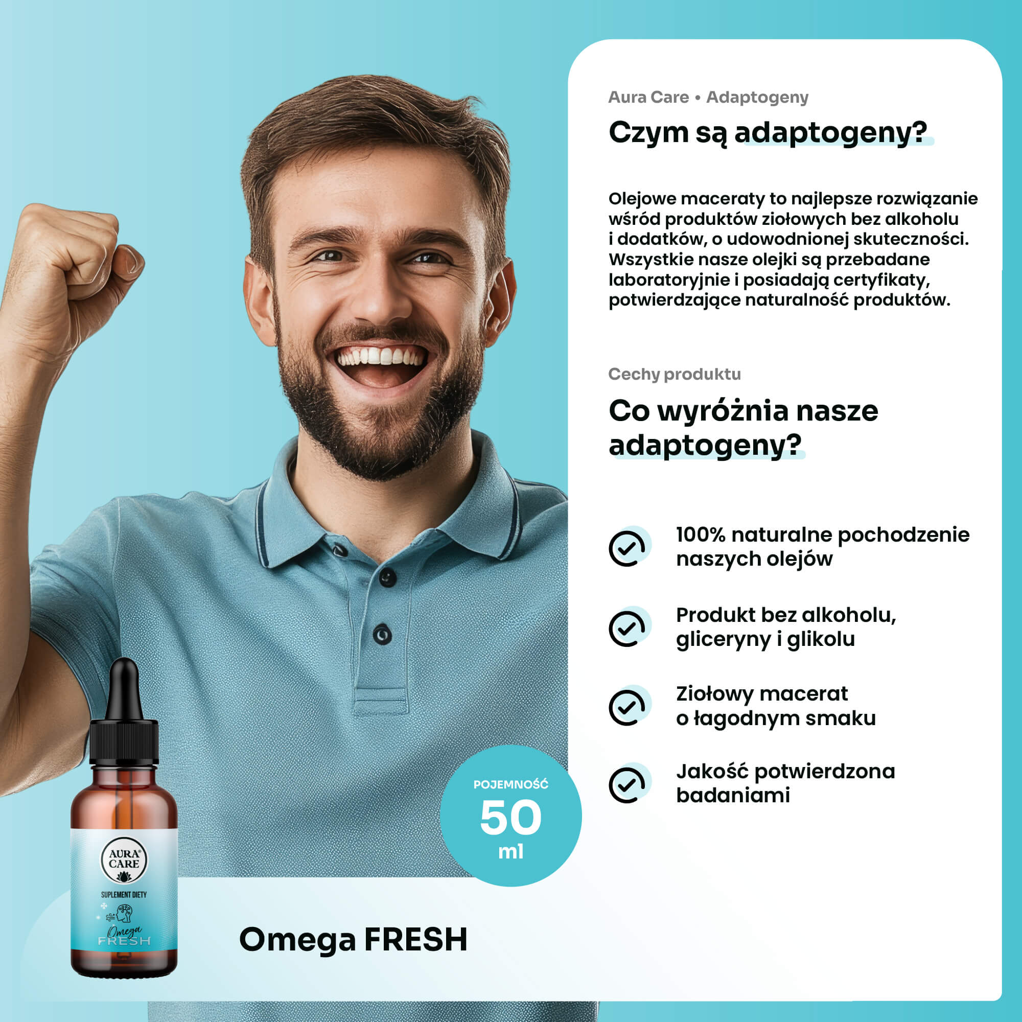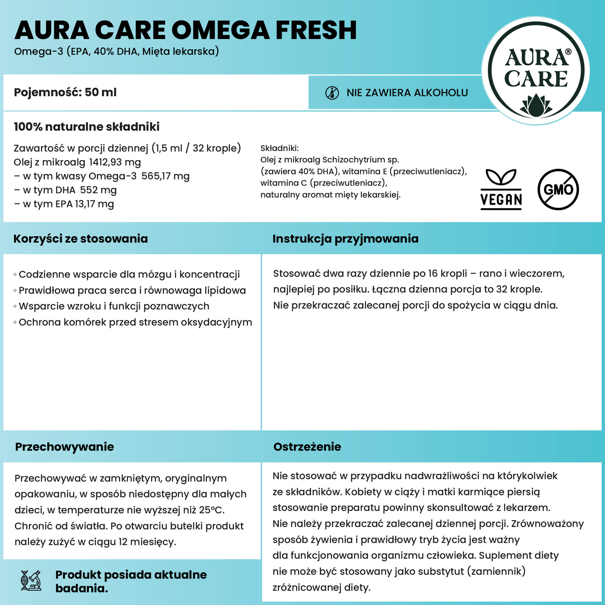 Codzienna suplementacja jeszcze nigdy nie była tak prosta i przyjemna. Omega Fresh to inteligentne połączenie 2w1 – czystych kwasów omega-3 z mikroalg i naturalnego odświeżenia po posiłku. Zamiast kolejnej kapsułki – kilka kropli, które jednocześnie wspierają Twój organizm, poprawiają trawienie i odświeżają oddech dzięki naturalnemu olejkowi z mięty lekarskiej.