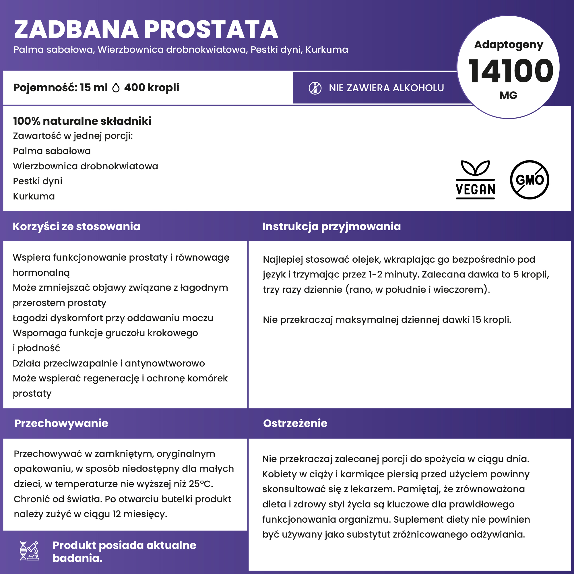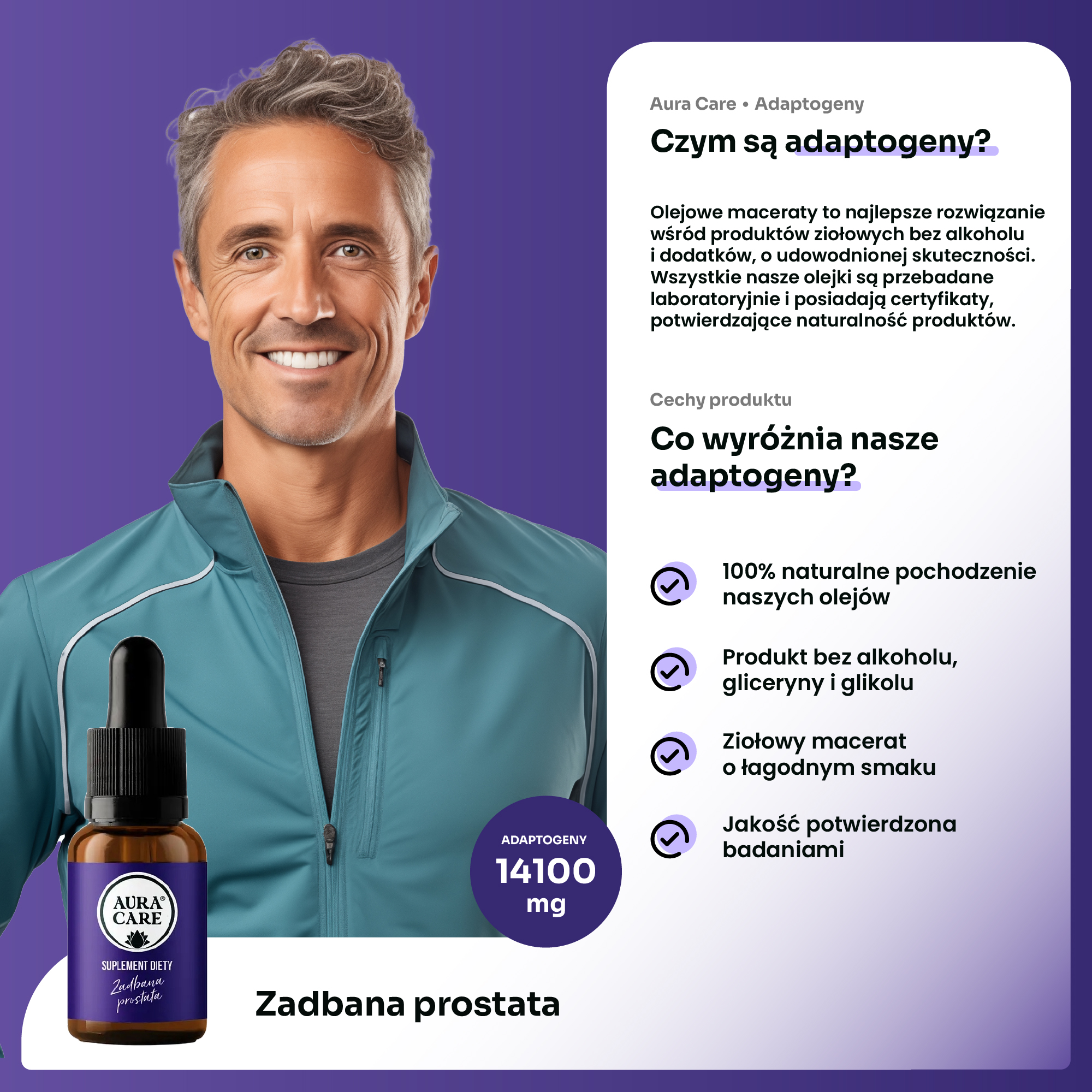 „Zadbana Prostata” to naturalna formuła oparta na skoncentrowanych maceratach olejowych – stworzona zarówno dla tych, którzy już zauważają pierwsze oznaki problemów z prostatą, jak i dla tych, którzy chcą działać zawczasu. To codzienne wsparcie, które realnie wpływa na komfort, równowagę hormonalną i ogólne samopoczucie mężczyzn – bez wstydu, bez czekania.