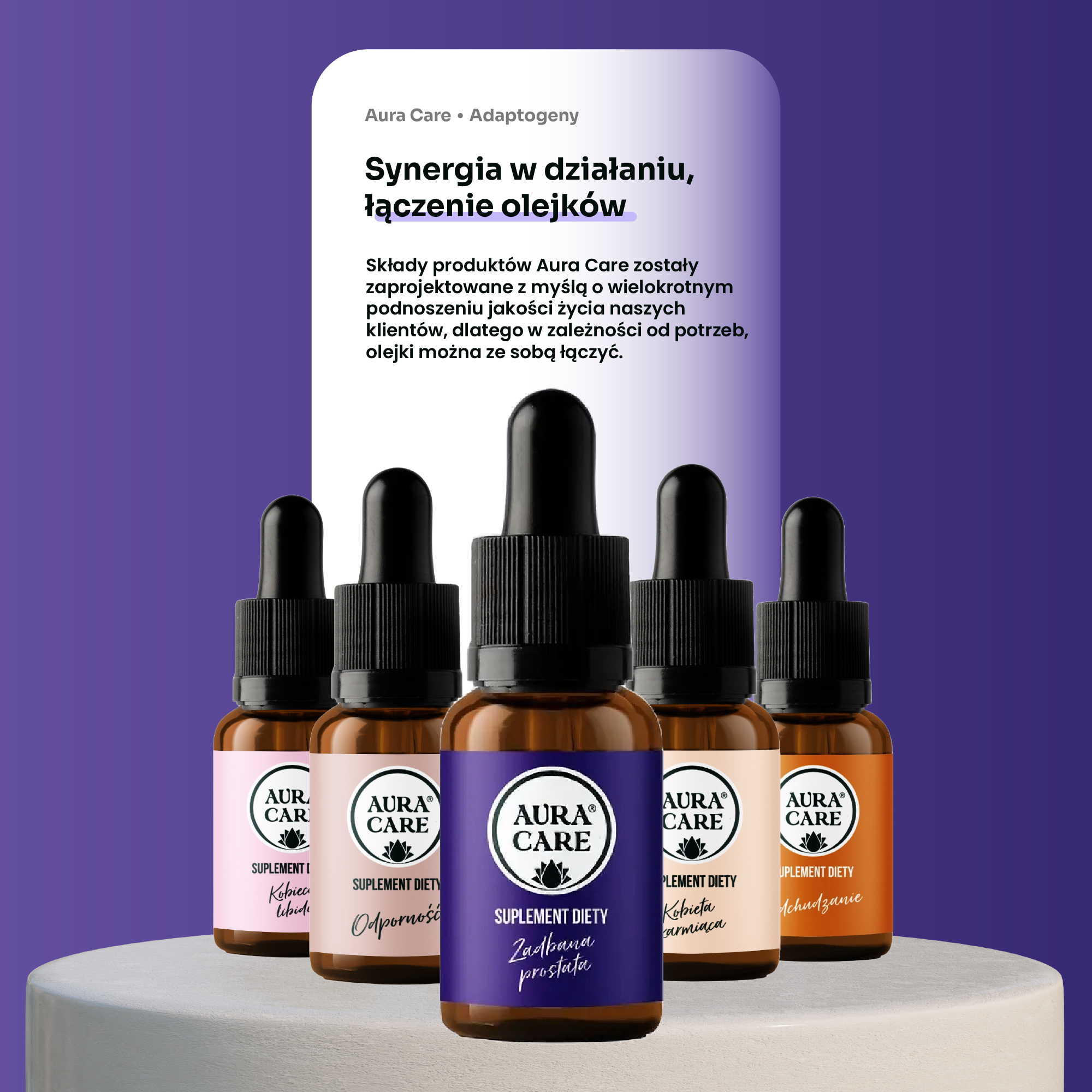 Olejki, probiotyki, witaminy, kolagen – potrzeby naszych organizmów są złożone, a my tworząc produkty Aura Care, myśleliśmy o tym, jak holistycznie się o niego zatroszczyć. Możesz bezpiecznie przyjmować kilka olejków jednocześnie, łączyć olejek z probiotykiem i zadbać także o skórę dzięki kolagenowi. Masz wątpliwości jak je dobrać? Skontaktuj się z naszym zespołem specjalistów.